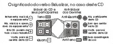 Tal figura é adaptada a seguir para explicar o significado do verbo bidualizar no caso deste CD. Note que ela apresenta o Terno deste CD que inclui as pessoas que o fizeram, os instrumentos e os equipamentos que o produziram e o próprio CD. Do outro lado, temos o nosso possível Quarto, que se decompõe no Anti-Terno dos que irão ouví-lo, composto por vocês, possíveis ouvintes, suas aparelhagens de som e o som que deles ouvirão.